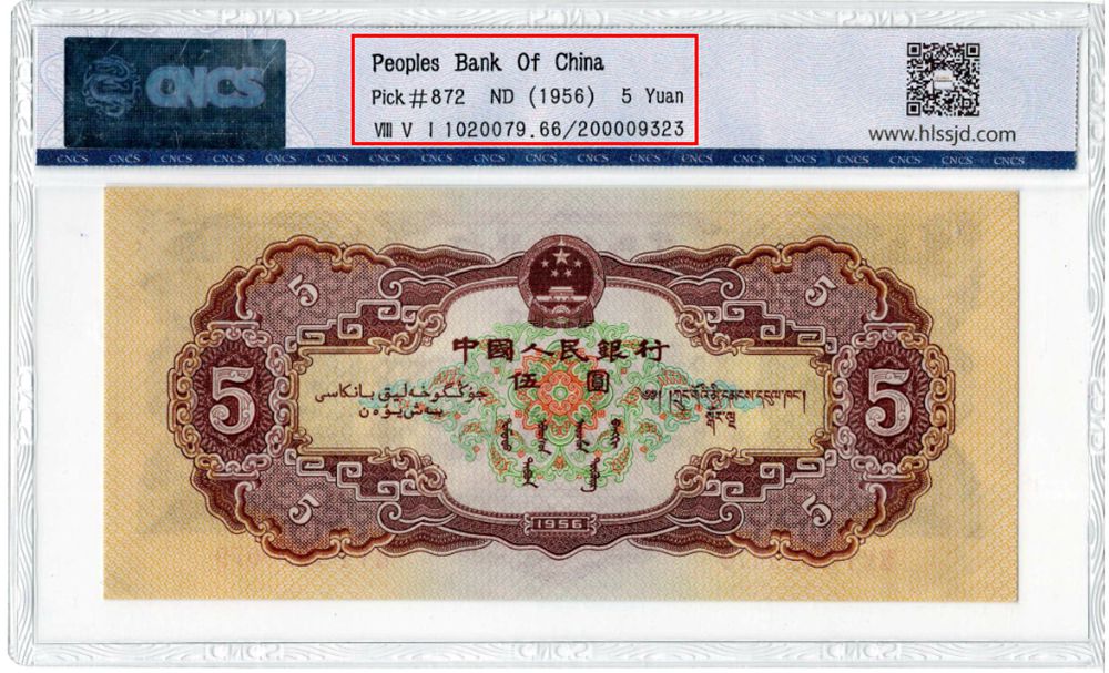 標(biāo)簽內(nèi)容:標(biāo)簽正面為該鑒評紙幣的中文信息,包括錢幣發(fā)行銀行,克勞斯目錄編號,發(fā)行年份,面值,查詢編號,分?jǐn)?shù)等信息,背面是與正面對應(yīng)的英文信息。